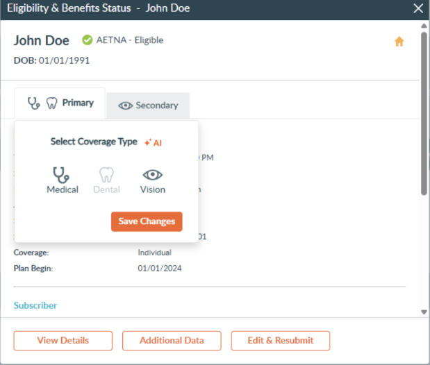 How this helps you: Staff can quickly identify coverage types without reviewing 271 responses or accessing payer portals, helping streamline eligibility workflows and reduce errors that can lead to claim denials.