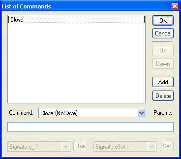 Commands can be added to Action Buttons by drawing a button using the Object Toolbar, then double-clicking to display the list of commands. Press the Add button and select "Close {NoSave}..." from the dropdown list.