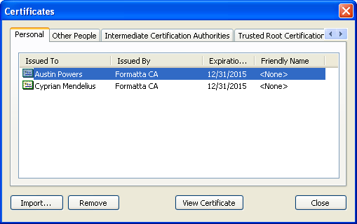 The Certificates Manager can be selected from the Tools | Options | Security | Certificates menu and is very similar with the one found in Internet Explorer, Outlook, and Outlook Express, giving users a familiar interface to work with. There are certificate stores for Personal, Other People, Intermediate Certification Authorities, and Trusted Root Certification Authorities. The user can import or remove certificates, and view certificate details and status, etc.