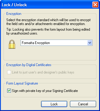 In addition, a form must be locked in order to enable encryption and/or signing of form data by users. The locking is a 2-step process. The first phase permits the form author to specify the cryptographic algorithms that will be used with the form. These preferences determine what encryption method will be used for protecting the layout and user data, and whether the form layout is to be signed with the author's personal certificate. The second phase is the actual locking of the form and happens when the form is saved to disk from within Formatta Designer: the fixed elements of the form (layout, lock preferences, etc.) are hashed, forming the layout hash. This hash is then optionally signed, then finally encrypted using the specified method.